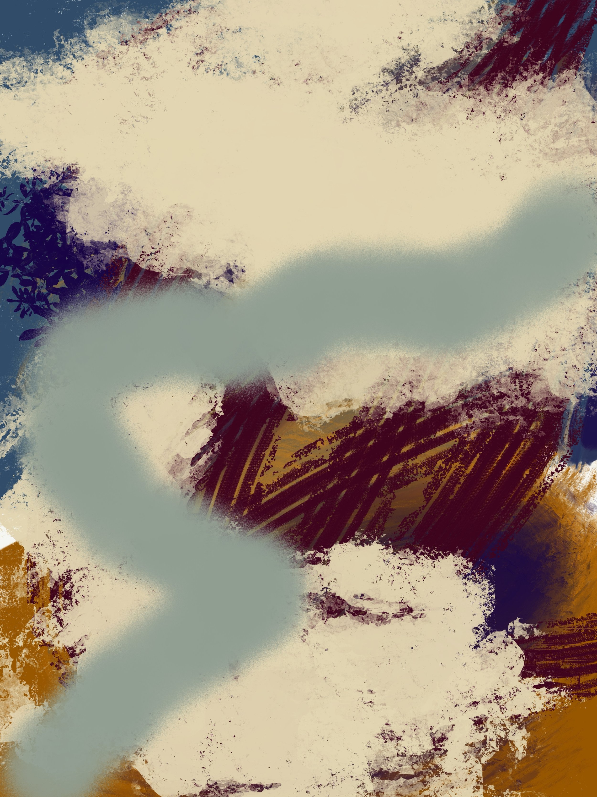 Original hand-painted digital painting of abstractly represented emotional residue wordless expression graffiti style urban landscape, in creamy ochre, celadon teal, and indigo plum palette.